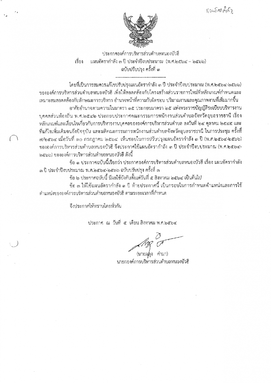 ประกาศองค์การบริหารส่วนตำบลหนองบัวฮี เรื่อง แผนอัตรากำลัง ๓ ปี ประจำปีงบประมาณ (พ.ศ. ๒๕๖๔-๒๕๖๖) ฉบับปรับปรุง ครั้งที่ ๓