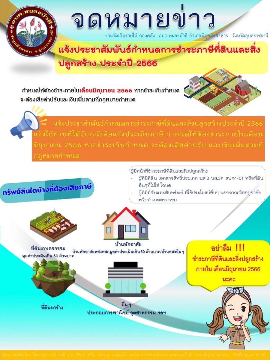 ประกาศประชาสัมพันธ์ เรื่อง กำหนดการชำระภาษีที่ดินและสิ่งปลูกสร้าง ประจำปี 2566 ครบกำหนดชำระภายใน 30 มิถุนายน 2566 หากชำระล่าช้าจะต้องเสียค่าปรับและเงินเพิ่มตามที่กฎหมายกำหนด ❌อย่าลืม ❗️❗️ มาชำระภาษีที่ดินและสิ่งปลูกสร้าง ณ งานจัดเก็บรายได้ กองคลัง อบต.หนองบัวฮี อำเภอพิบูลมังสาหาร จังหวัดอุบลราชธานี