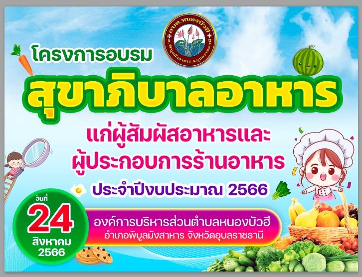 โครงการอบรมสุขาภิบาลอาหารแก่ผู้สัมผัสอาหารและผู้ประกอบการร้านอาหาร ประจำปีงบประมาณ 2566 ในวันพฤหัสบดีที่ 24 สิงหาคม 2566 เวลา 08.30 น. เป็นต้นไป ณ ห้องประชุมองค์การบริหารส่วนตำบลหนองบัวฮี ตำบลหนองบัวฮี อำเภอพิบูลมังสาหาร จังหวัดอุบลราชธานี เพื่อให้ความรู้ความเข้าใจเกี่ยวกับสุขาภิบาลอาหาร ให้ประชาชนในพื้นที่ตำบลหนองบัวฮี ได้ปรุงประกอบอาหารได้ถูกสุขลักษณะ และมีความรู้ในการเลือกซื้อและบริโภคอาหารที่สะอาดปลอดภัยมีประโยชน์ต่อสุขภาพ