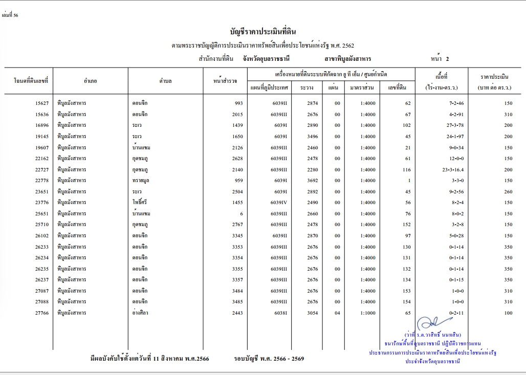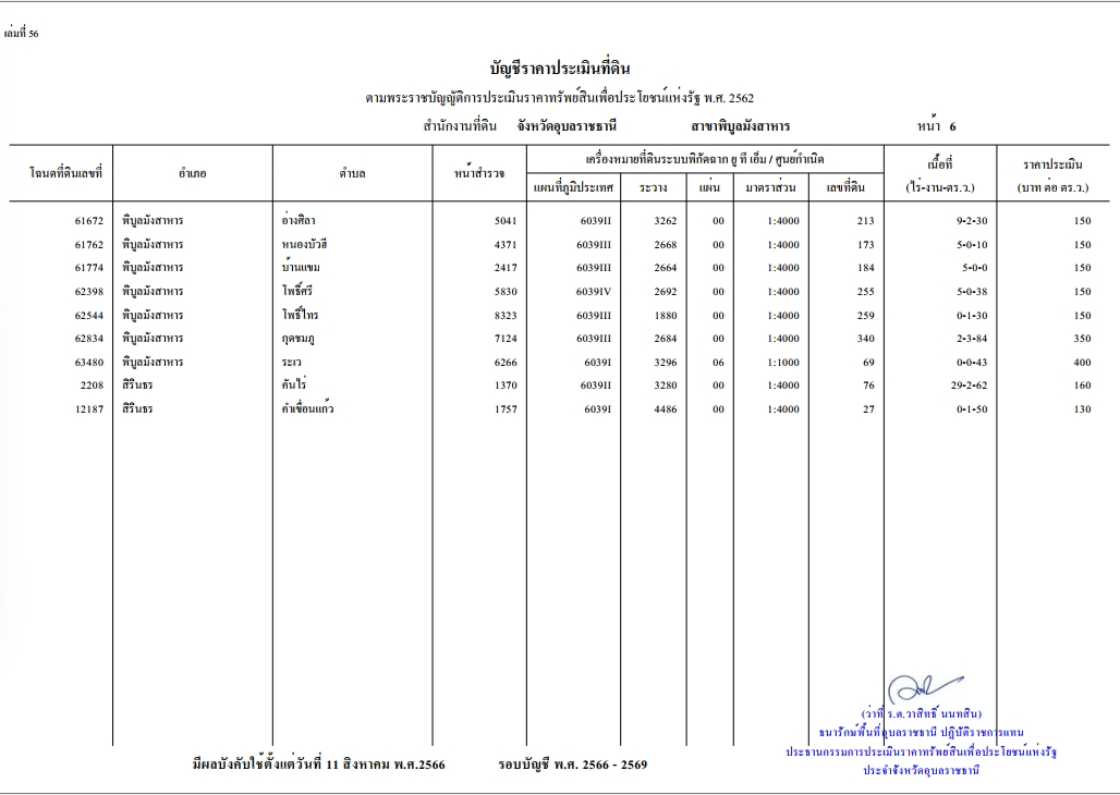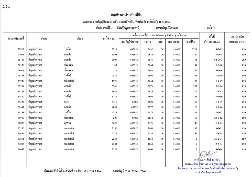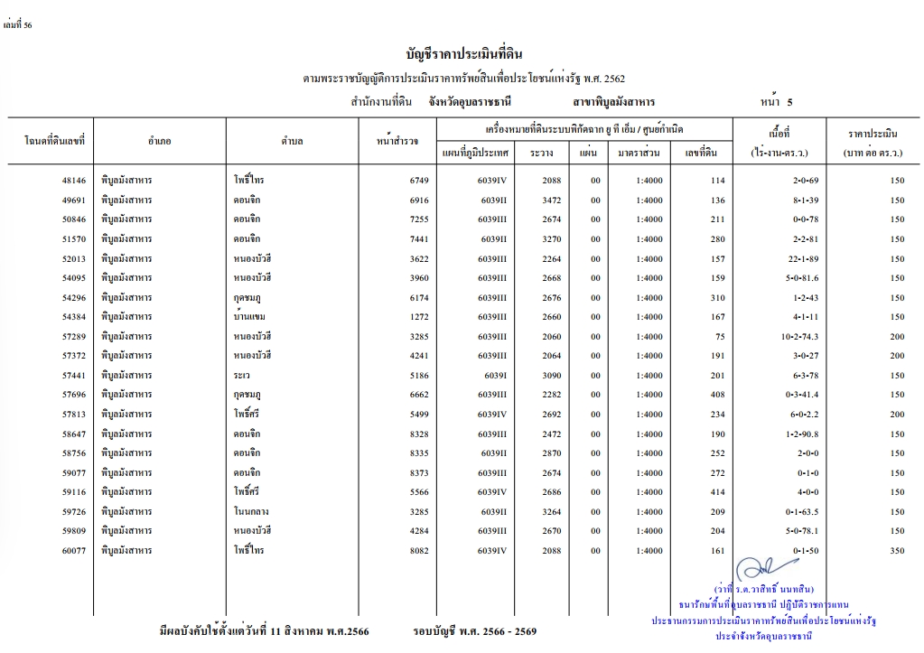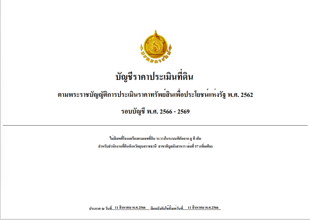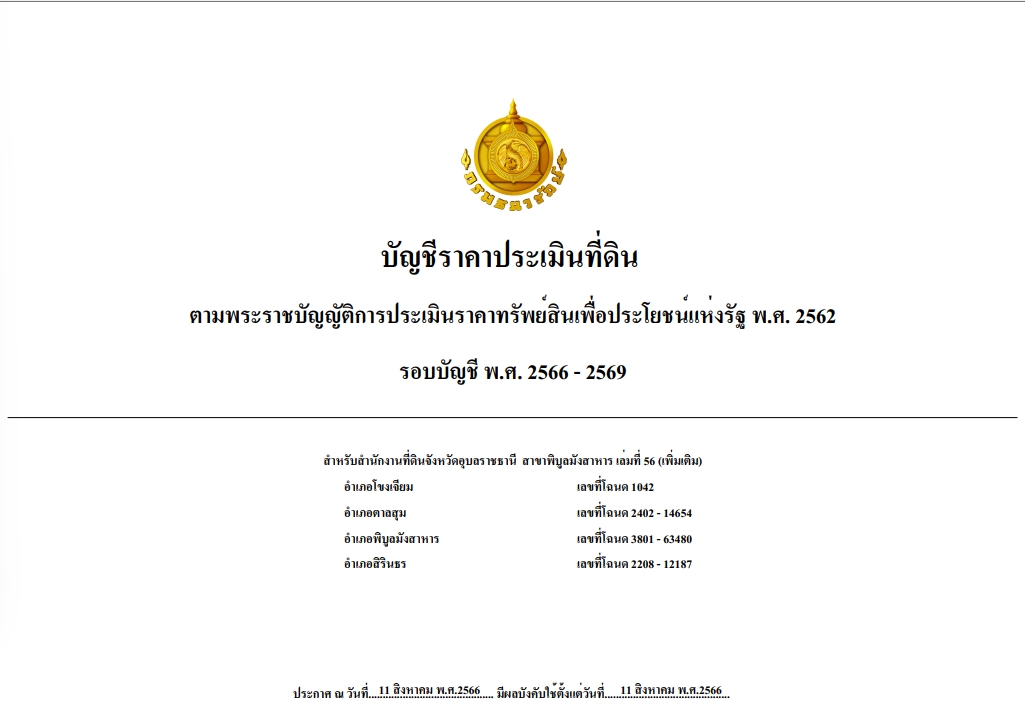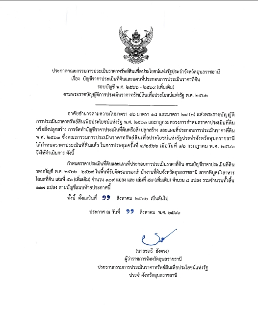ประกาศคณะกรรมการประเมินราคาทรัพย์สินเพื่อประโยชน์แห่งรัฐประจำจังหวัดอุบลราชธานี เรื่อง บัญชีราคาประเมินที่ดินและแผนที่ประกอบการประเมินราคาที่ดิน รอบบัญชี พ.ศ. 2566 - 2569 (เพิ่มเติม) ตามพระราชบัญญัติการประเมินราคาทรัพย์สินเพื่อประโยชน์แห่งรัฐ พ.ศ. 2562