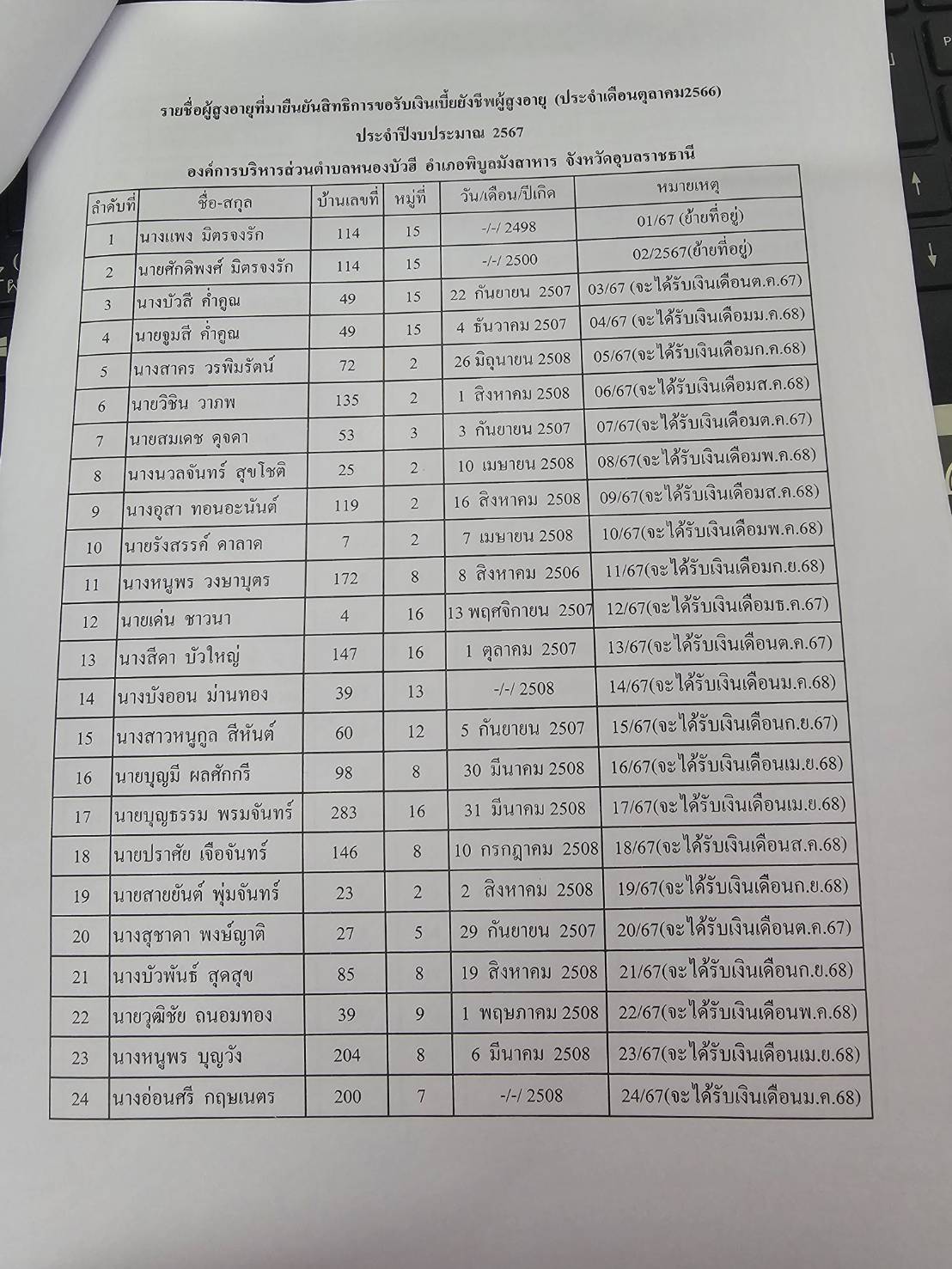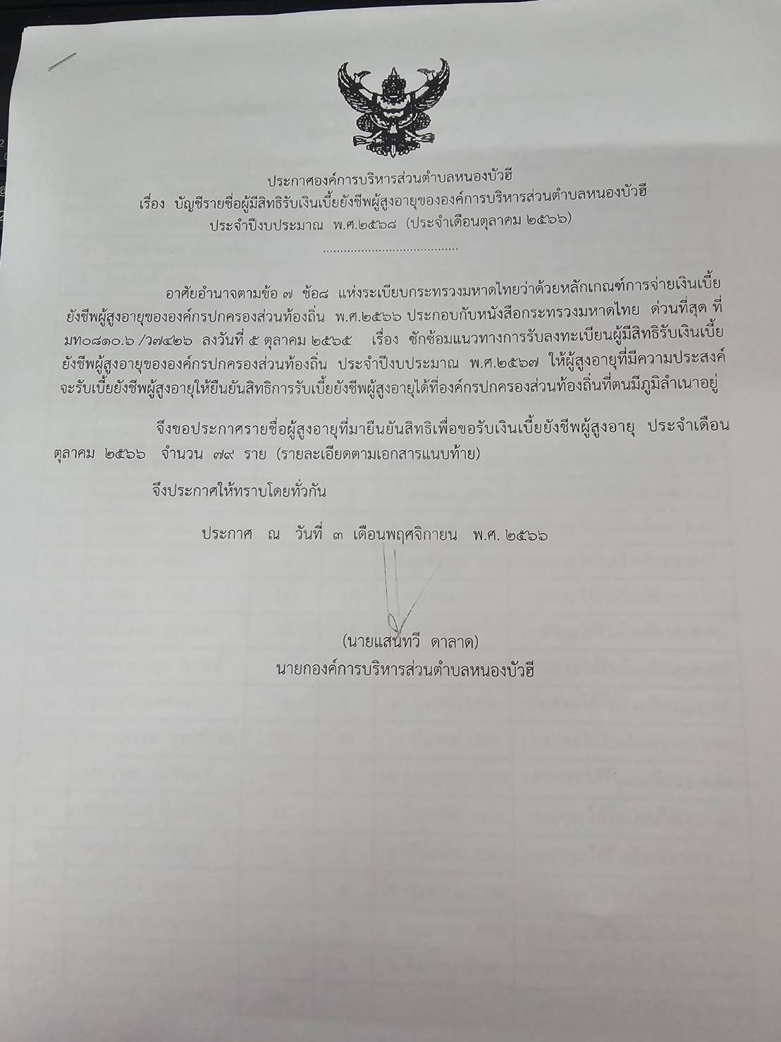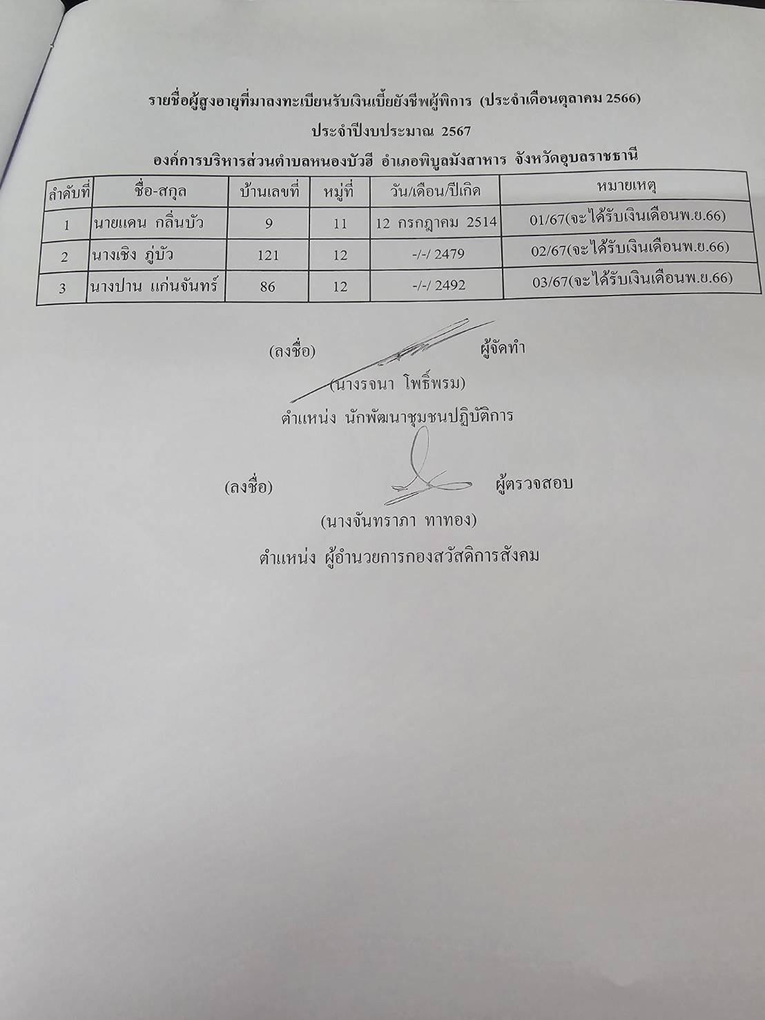 - บัญชีรายชื่อผู้มีสิทธิรับเงินเบี้ยยังชีพผู้สูงอายุขององค์การบริหารส่วนตำบลหนองบัวฮี ประจำปีงบประมาณ พ.ศ. 2568 ประจำเดือน ตุลาคม 2566