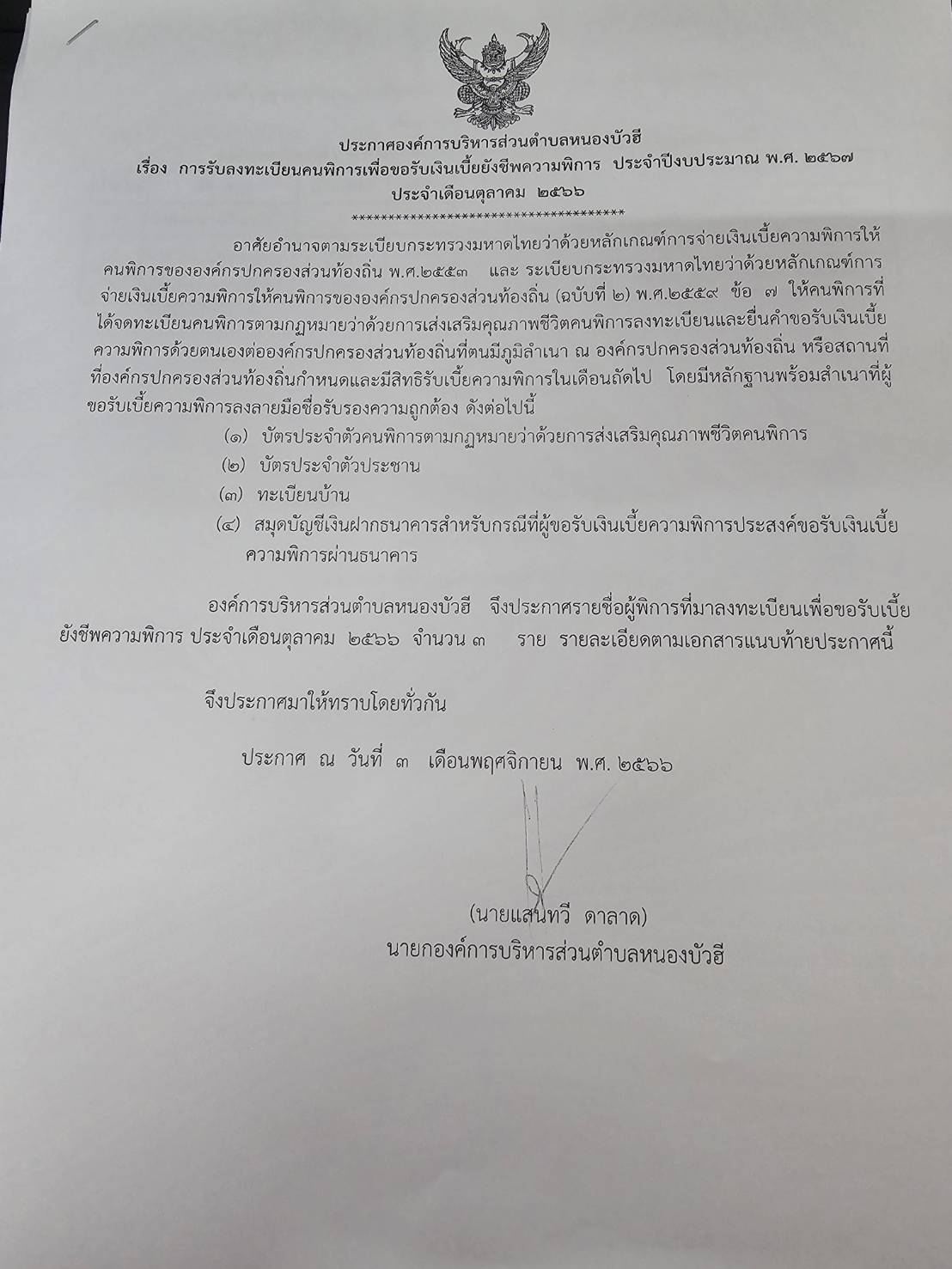 - การรับลงทะเบียนคนพิการเพื่อขอรับเงินเบี้ยยังชีพความพิการ ประจำปีงบประมาณ พ.ศ. 2567 ประจำเดือน ตุลาคม 2566