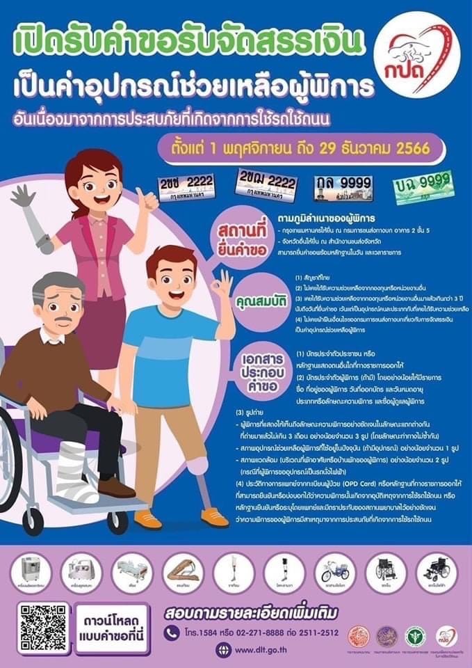 กองทุนเพื่อความปลอดภัยในการใช้รถใช้ถนน เปิดรับคำขอรับจัดสรรเงินเป็นค่าอุปกรณ์ช่วยเหลือผู้พิการ อันเนื่องมาจากการประสบภัยที่เกิดจากการใช้รถใช้ถนน ตั้งแต่วันที่ 1 พฤศจิกายน ถึง 29 ธันวาคม 2566