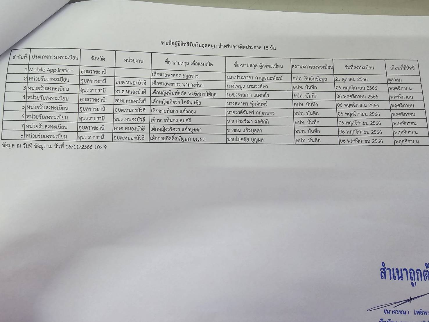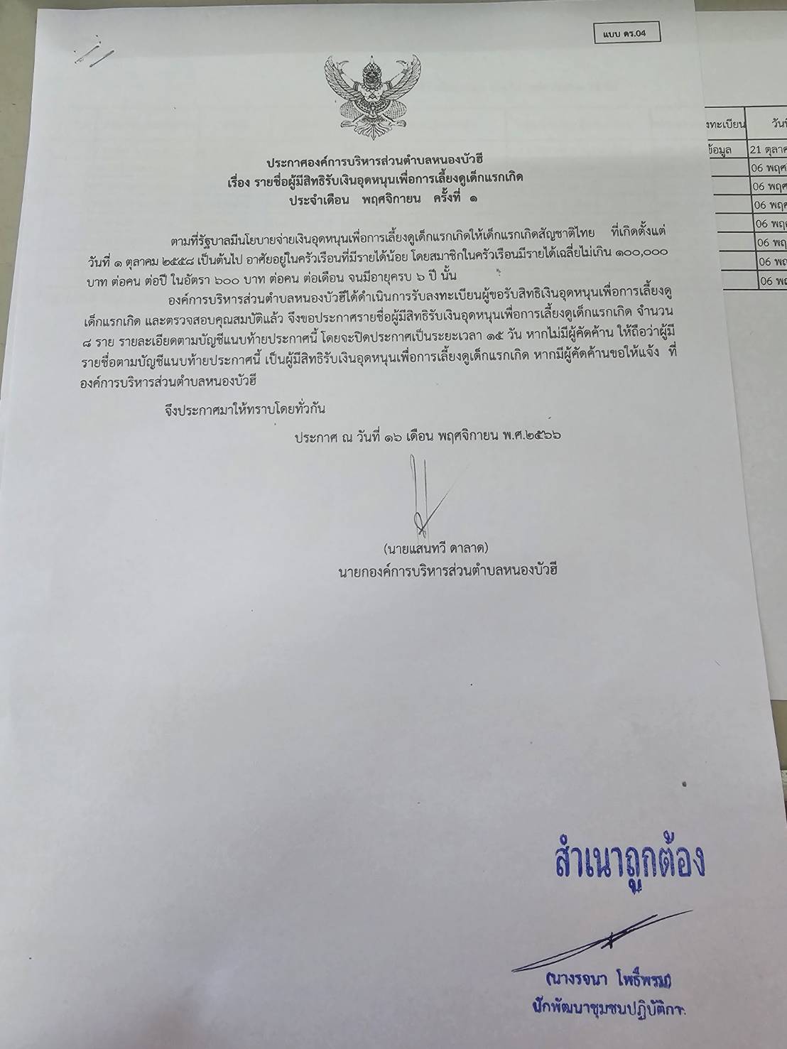 รายชื่อผู้มีสิทธิรับเงินอุดหนุนเพื่อการเลี้ยงดูเด็กแรกเกิด ประจำเดือน พฤศจิกายน 2566 ครั้งที่ 1