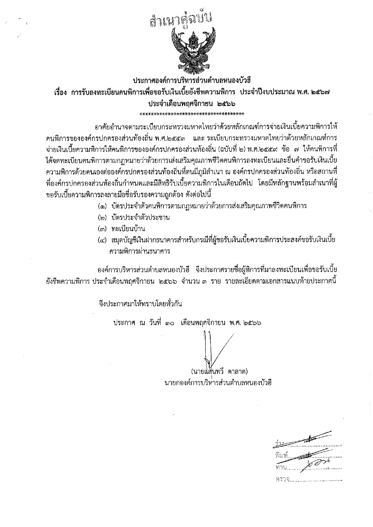 - การรับลงทะเบียนคนพิการเพื่อขอรับเงินเบี้ยยังชีพความพิการ ประจำปีงบประมาณ พ.ศ.2567 ประจำเดือนพฤศจิกายน 2566
