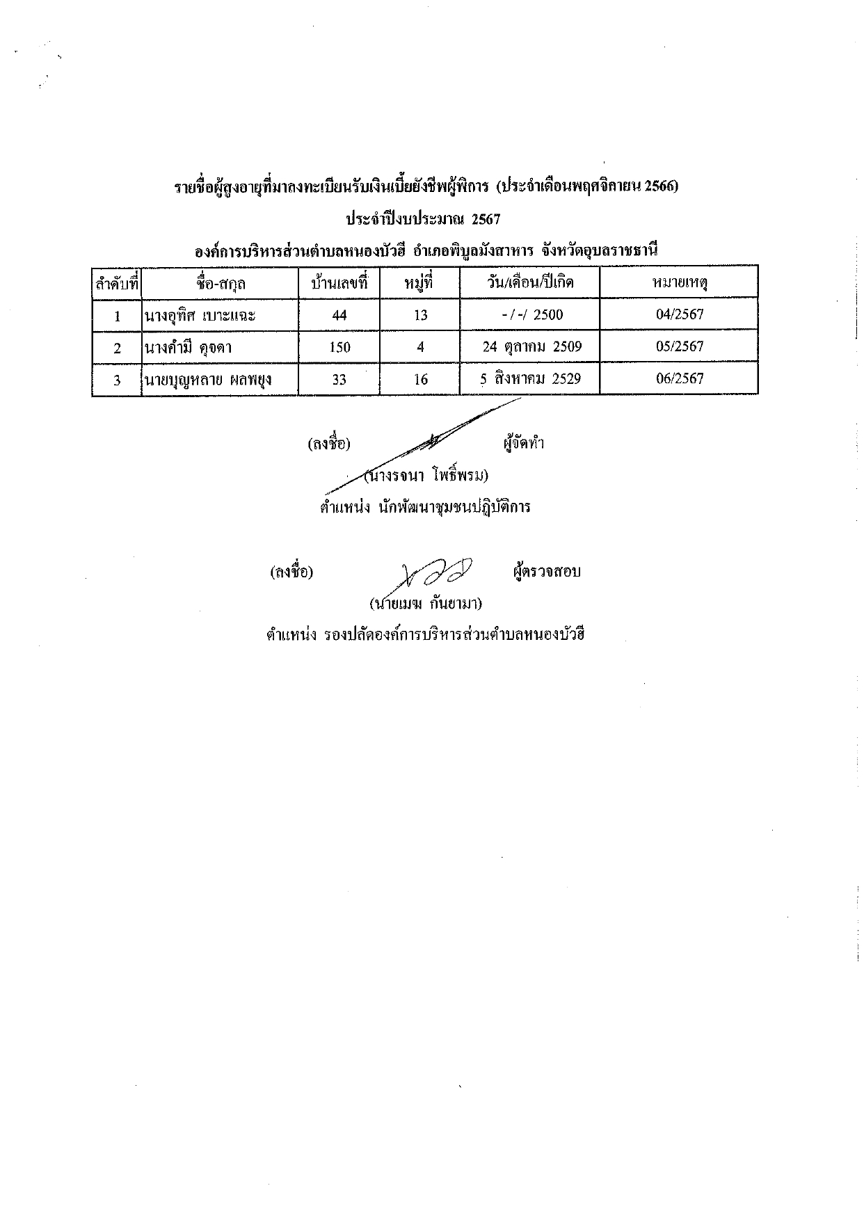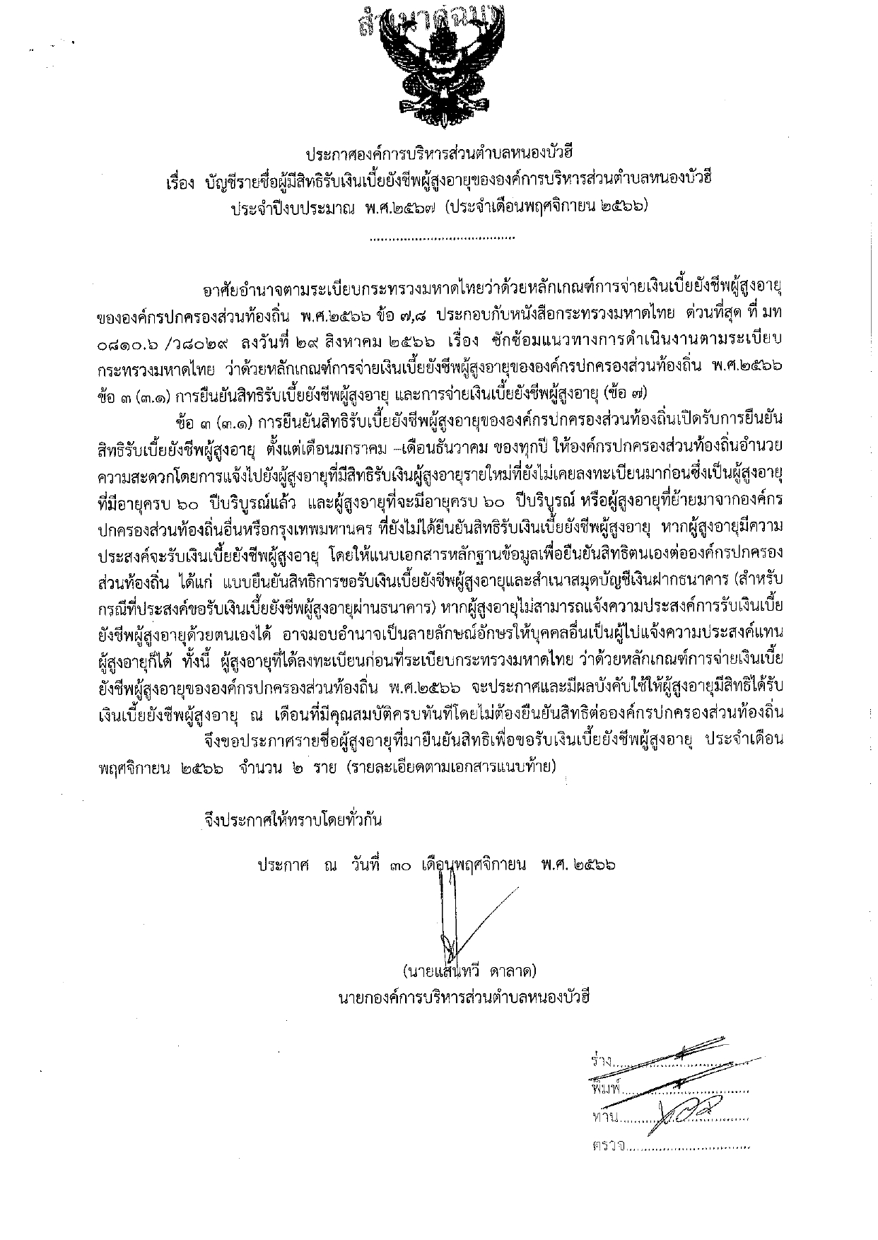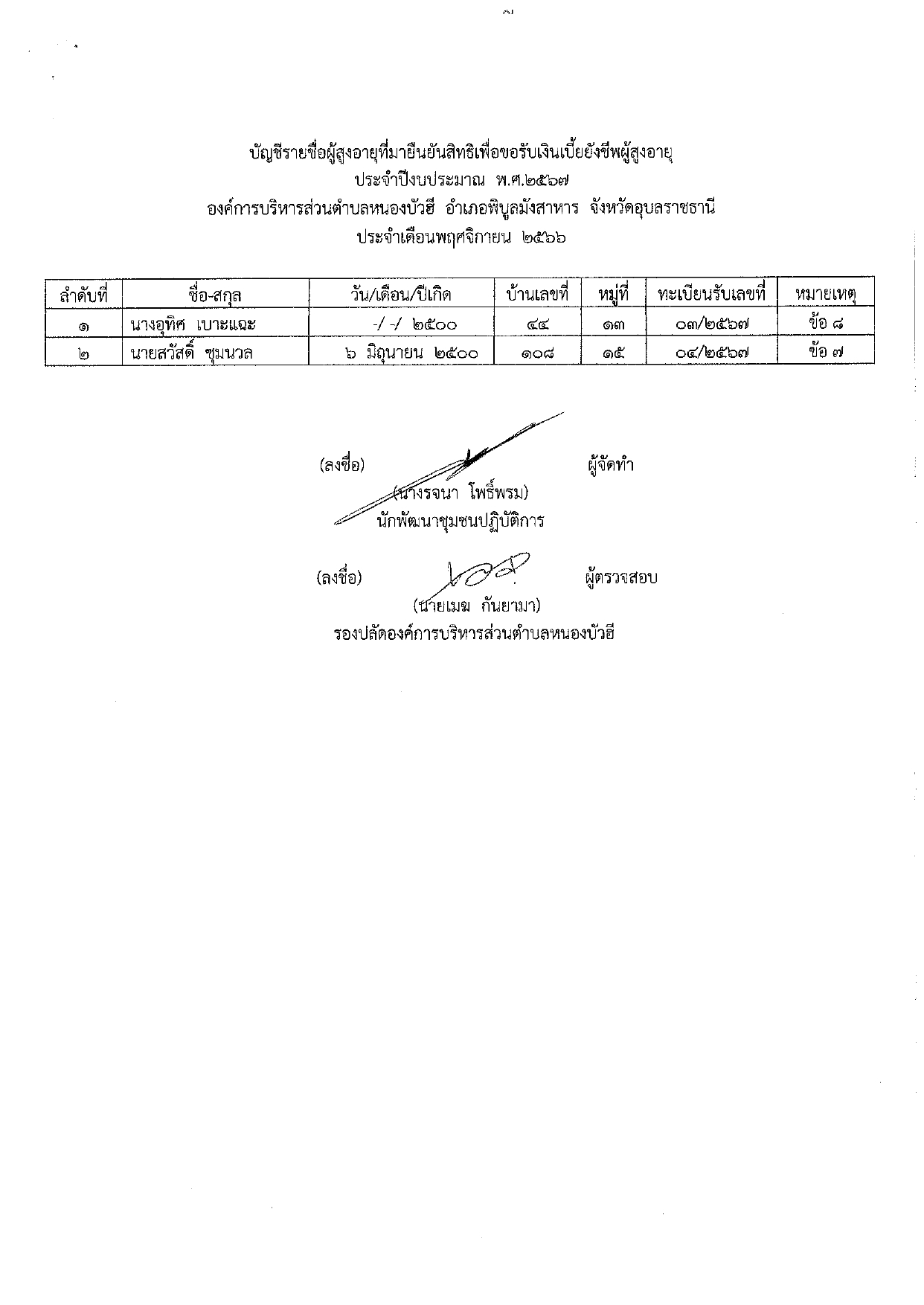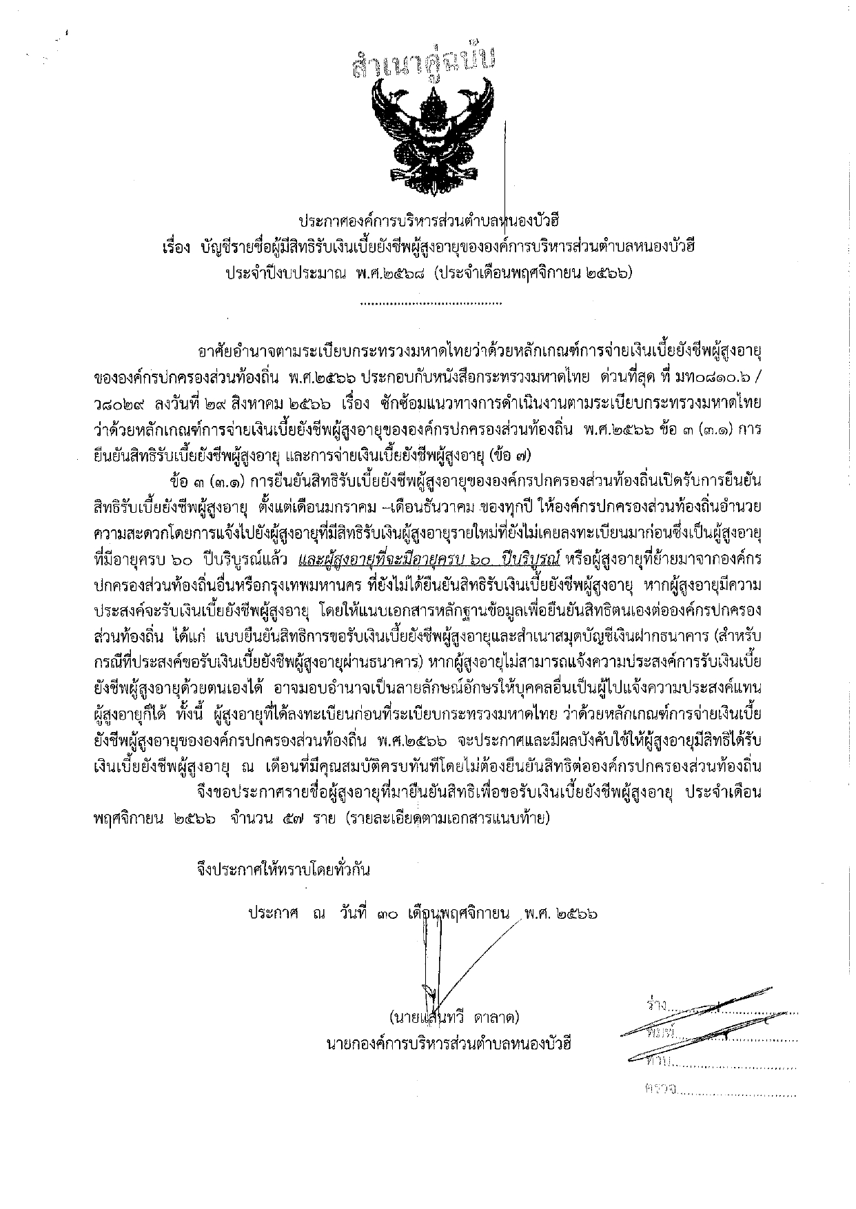 - บัญชีรายชื่อผู้มีสิทธิรับเงินเบี้ยยังชีพผู้สูงอายุขององค์การบริหารส่วนตำบลหนองบัวฮี ประจำปีงบประมาณ พ.ศ.2567 (ประจำเดือนพฤศจิกายน 2566)