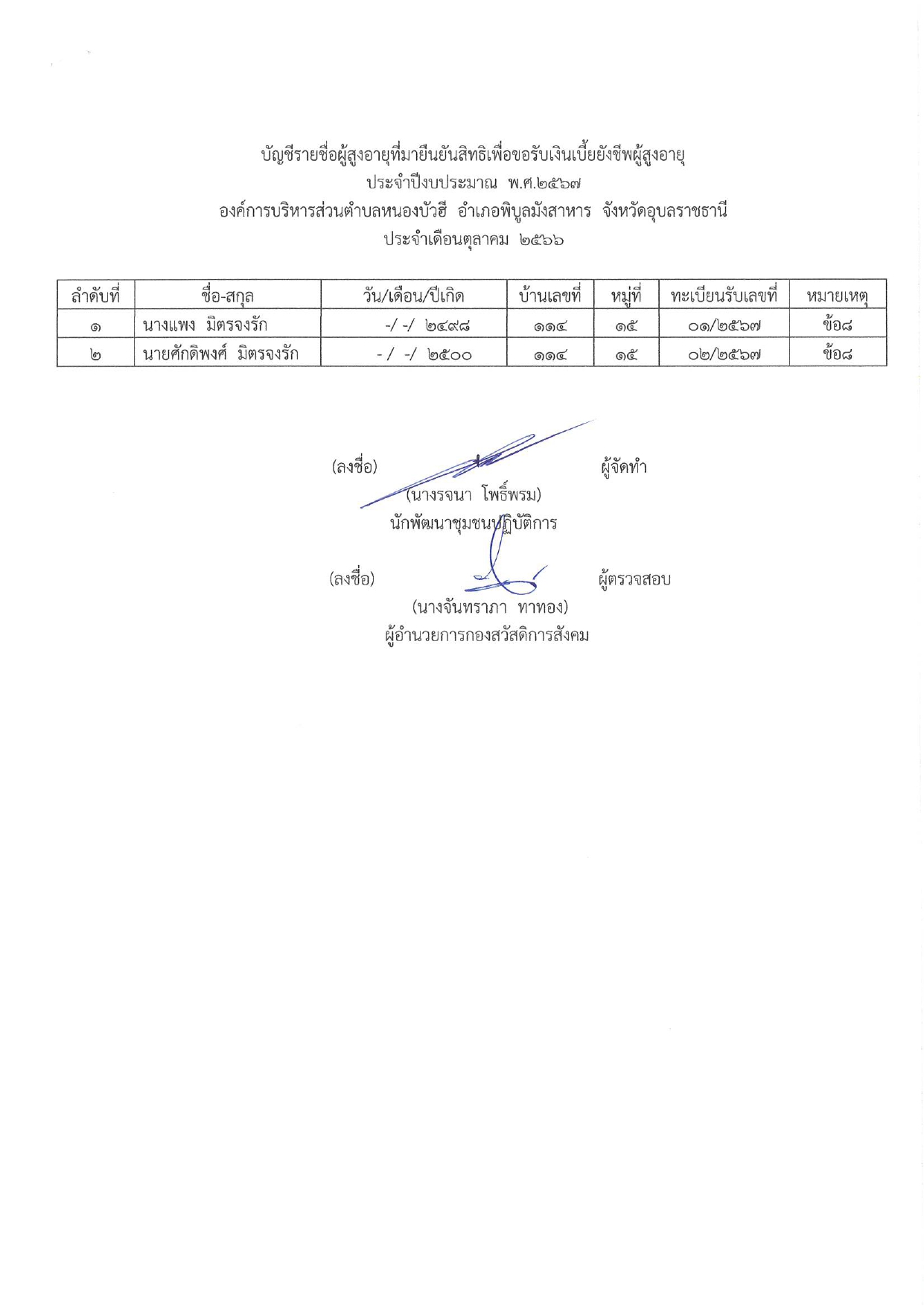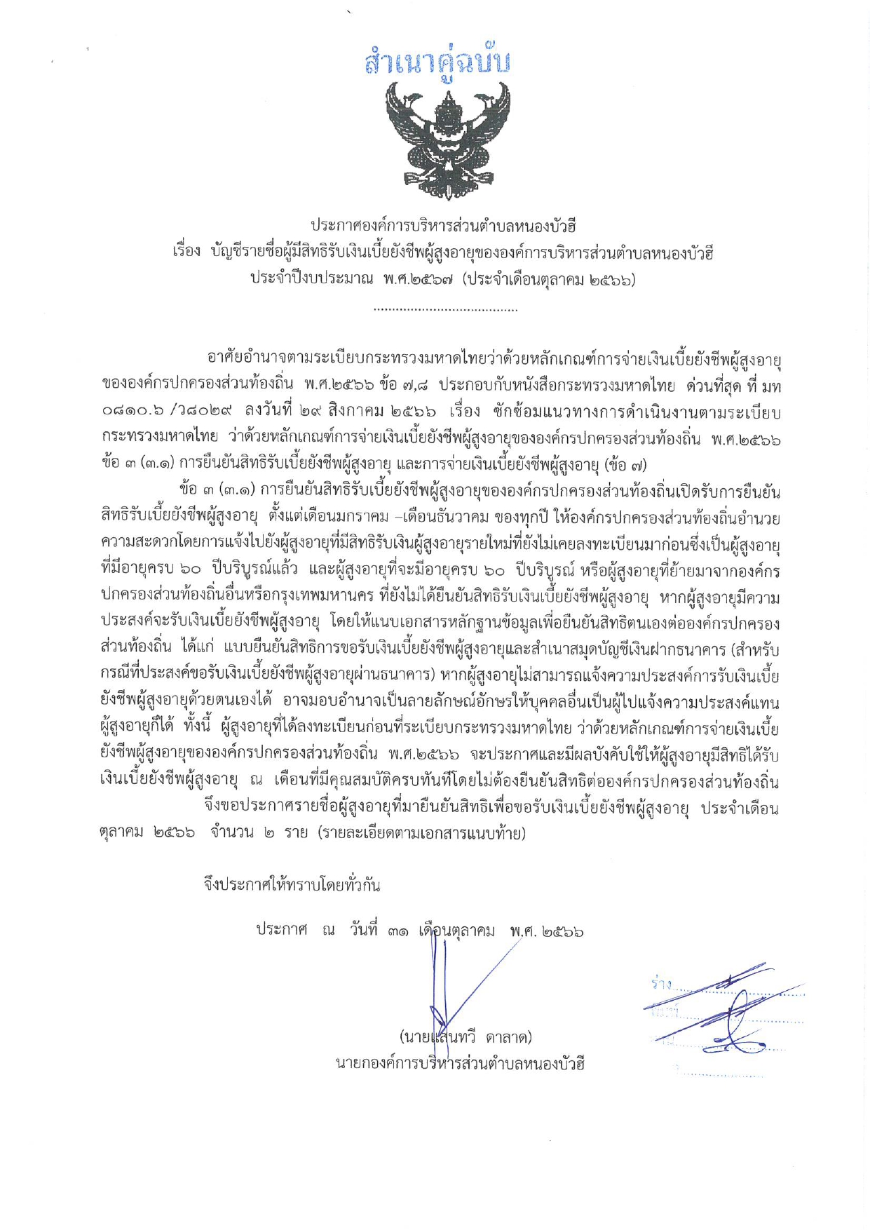 - บัญชีรายชื่อผู้มีสิทธิรับเงินเบี้ยยังชีพผู้สูงอายุขององค์การบริหารส่วนตำบลหนองบัวฮี ประจำปีงบประมาณ พ.ศ.2567 (ประจำเดือนตุลาคม 2566)