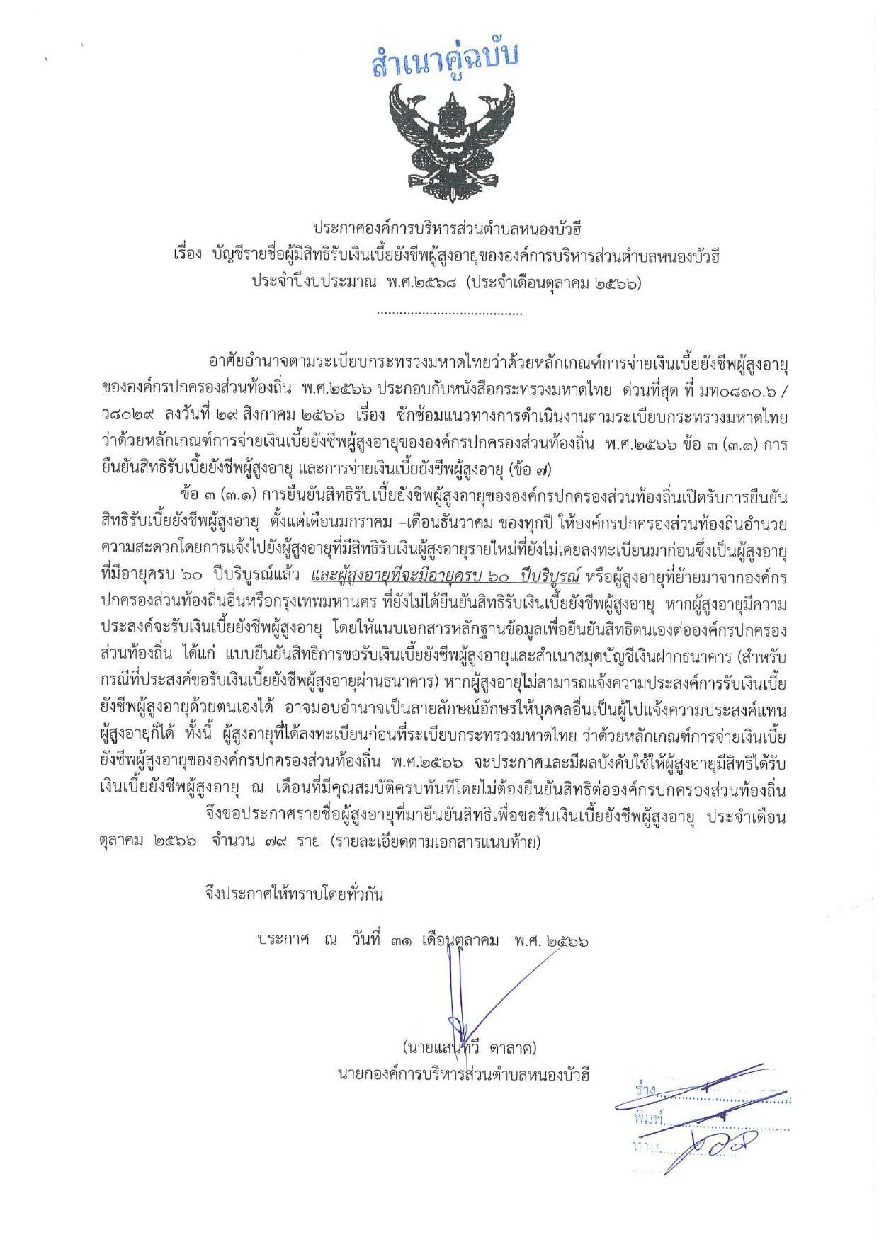 - บัญชีรายชื่อผู้มีสิทธิรับเงินเบี้ยยังชีพผู้สูงอายุขององค์การบริหารส่วนตำบลหนองบัวฮี ประจำปีงบประมาณ พ.ศ.2568 (ประจำเดือนตุลาคม 2566)