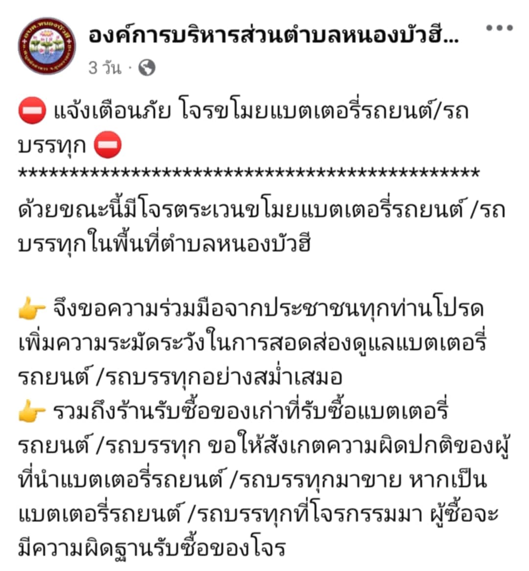 ด้วยขณะนี้มีโจรตระเวนขโมยแบตเตอรี่รถยนต์ /รถบรรทุกในพื้นที่ตำบลหนองบัวฮี