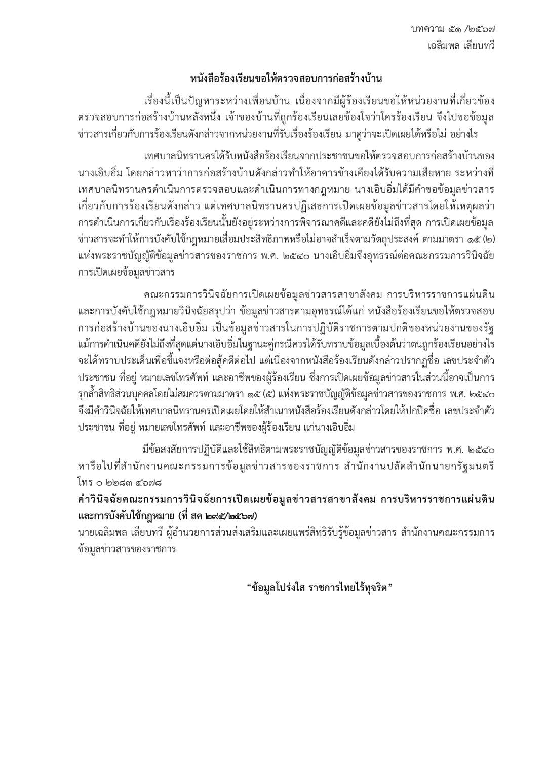 1. บทความ 51/2567 หนังสือร้องเรียนขอให้ตรวจสอบการก่อสร้างบ้าน