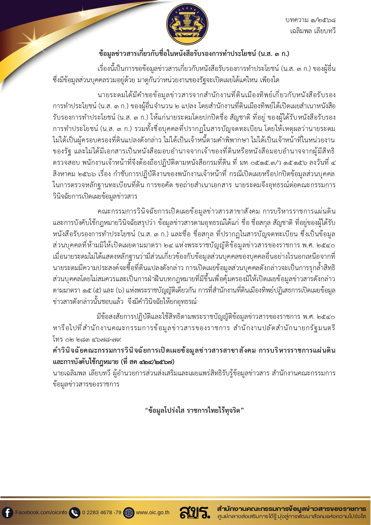 1. บทความ 1/2568 ข้อมูลข่าวสารเกี่ยวกับชื่อในหนังสือรับรองการทำประโยชน์ (นส. 3 ก.)