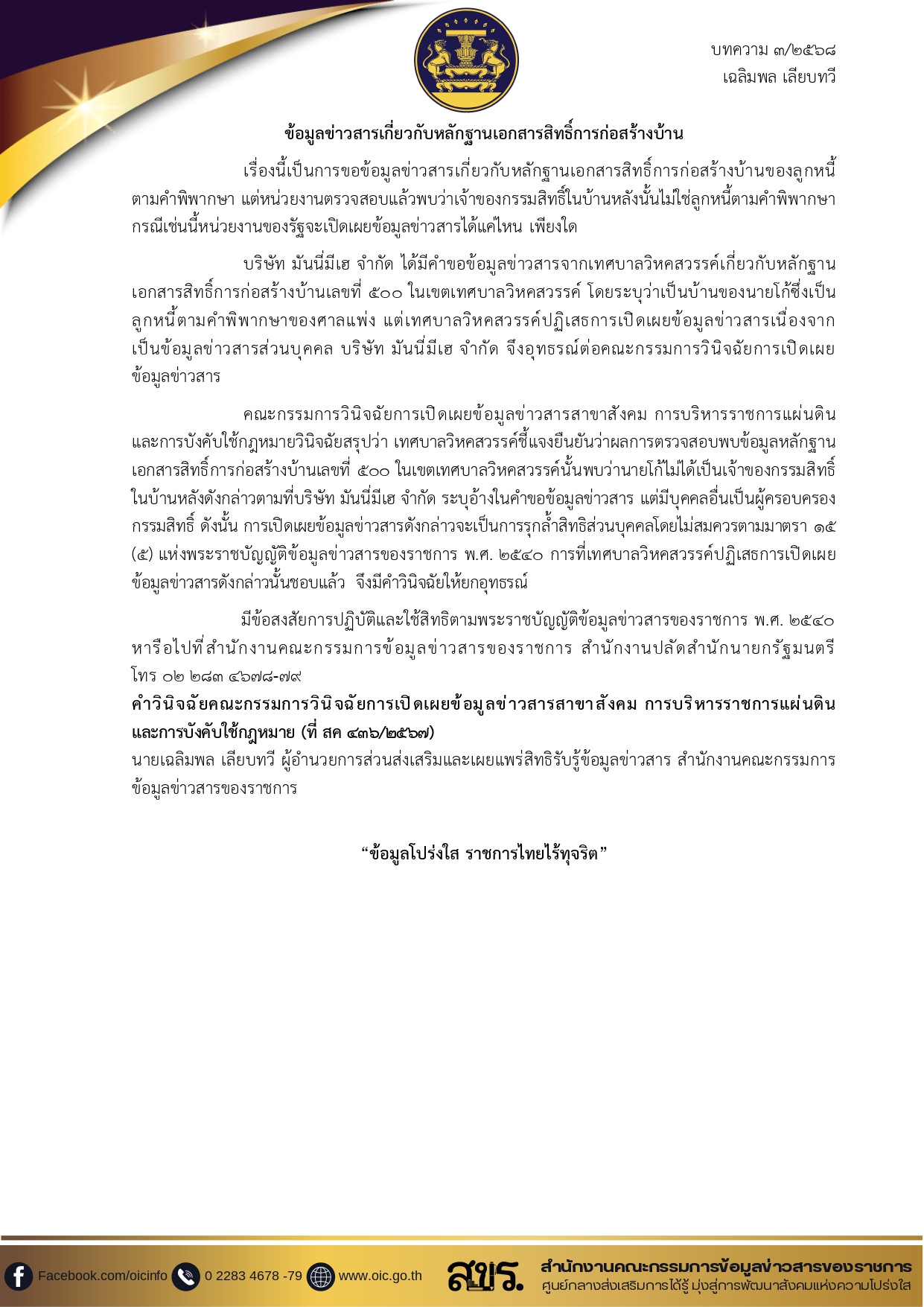 3/2568 ข้อมูลข่าวสารเกี่ยวกับหลักฐานเอกสารสิทธิ์การก่อสร้างบ้าน 4. บทความ