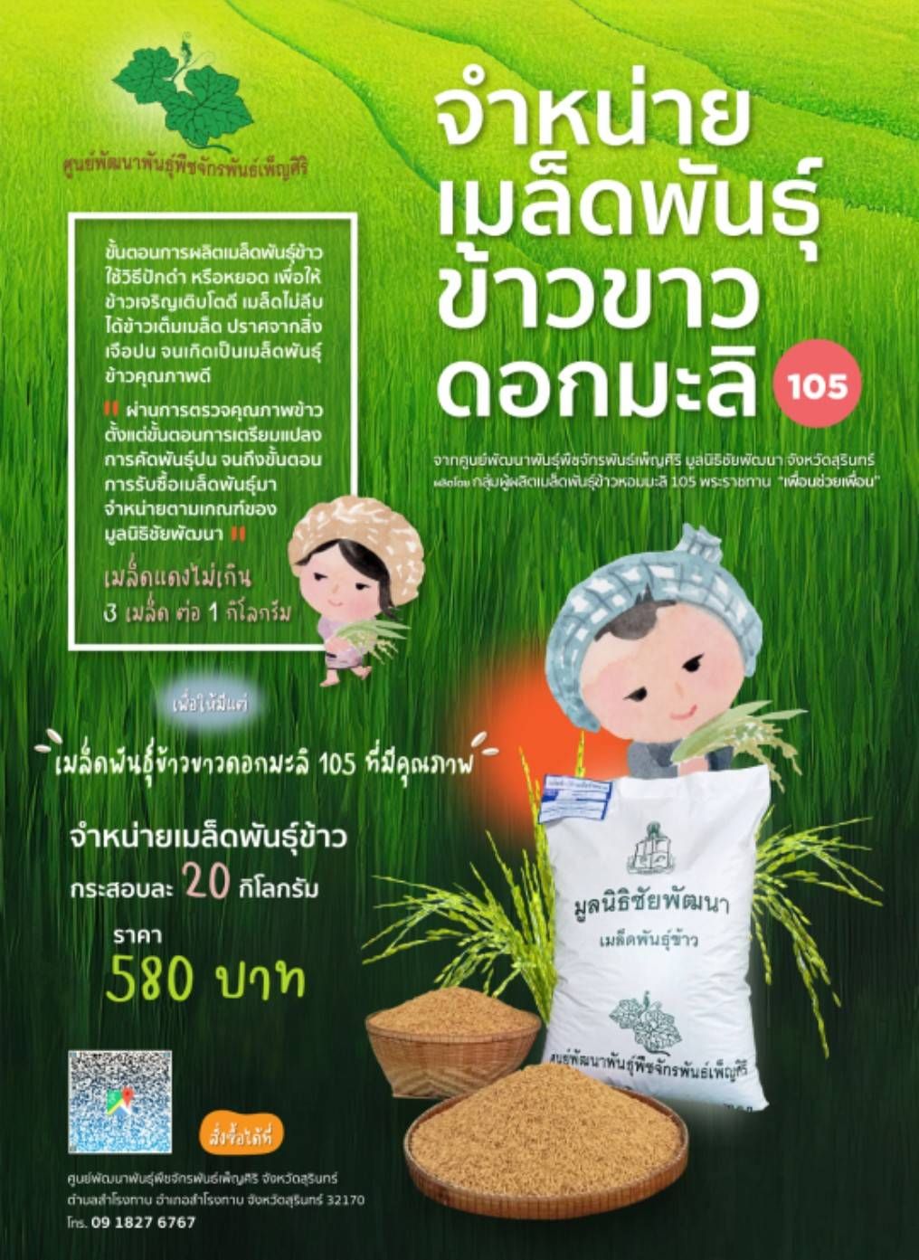 ประชาสัมพันธ์การจำหน่ายเมล็ดพันธุ์ข้าวขาวดอกมะลิ 105 ของศูนย์พัฒนาพืชจักรพันธ์เพ็ญศิริ มูลนิธิชัยพัฒนาจังหวัดสุรินทร์
