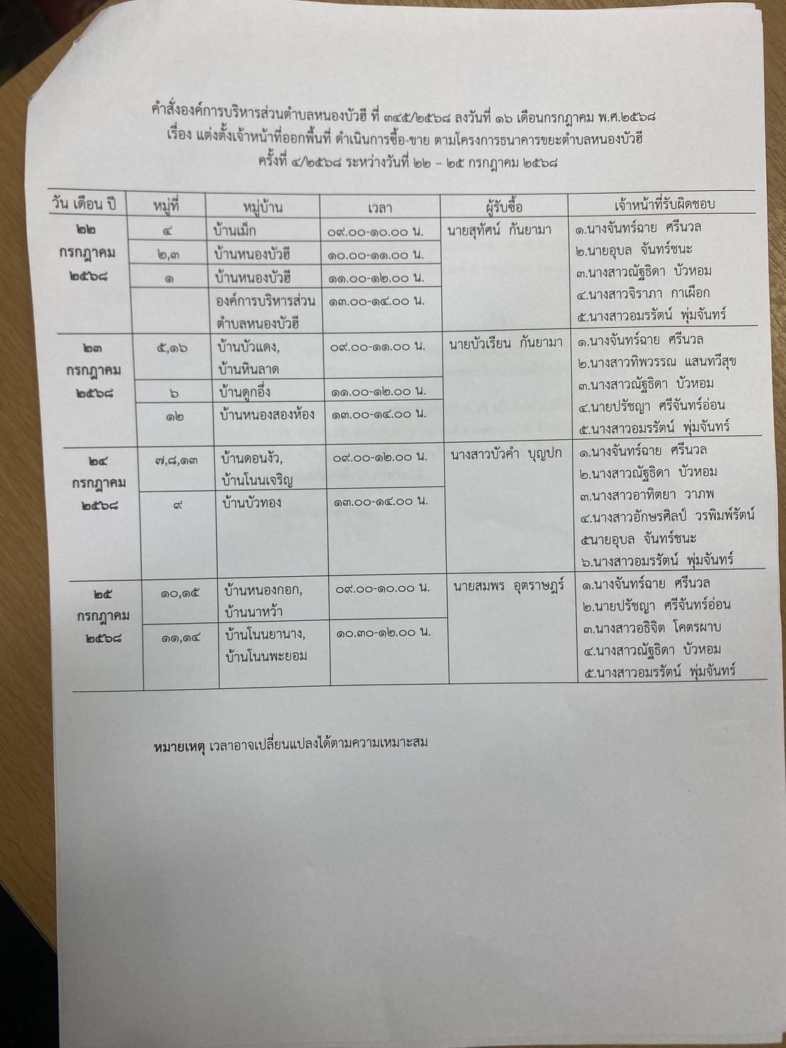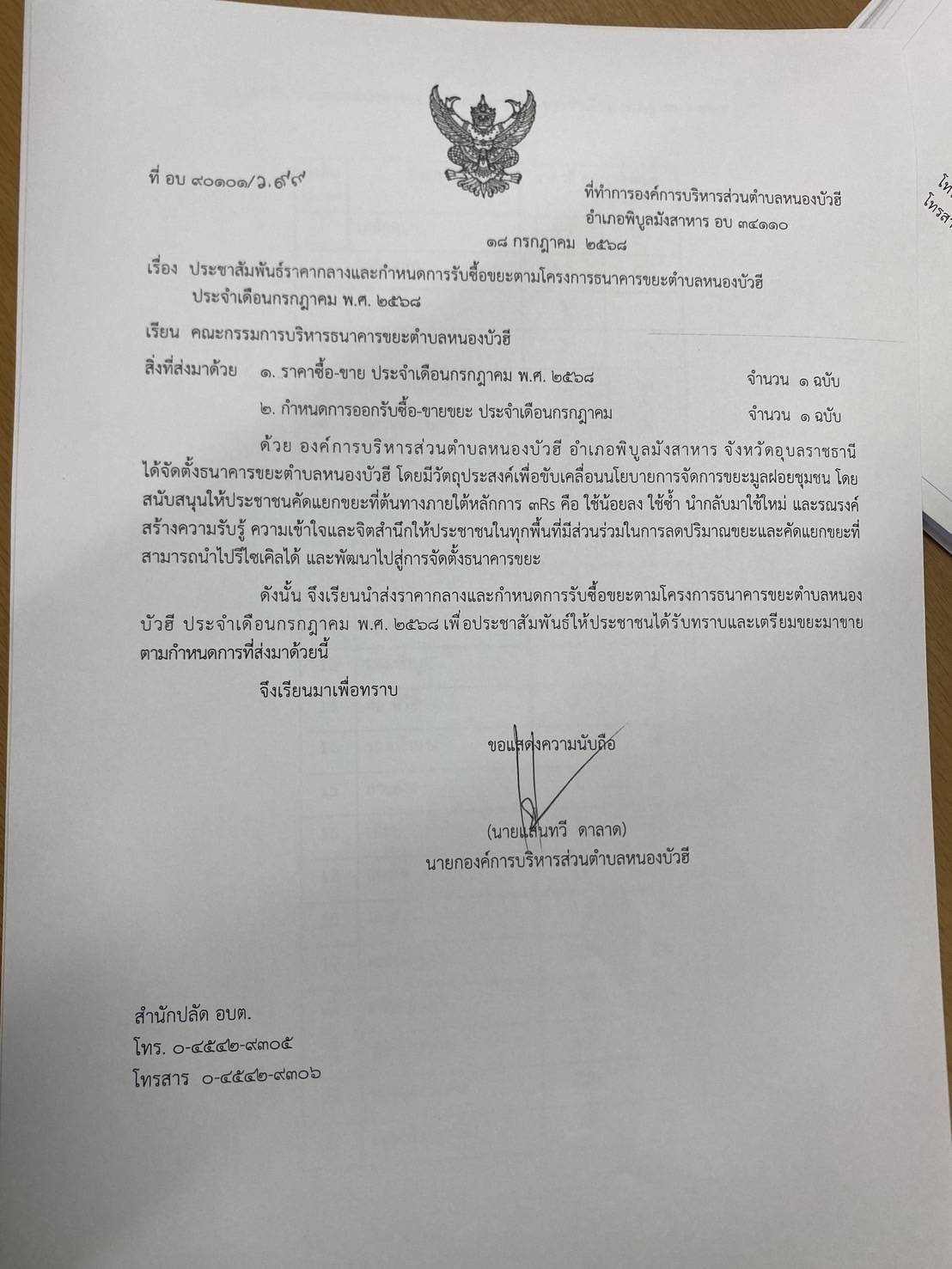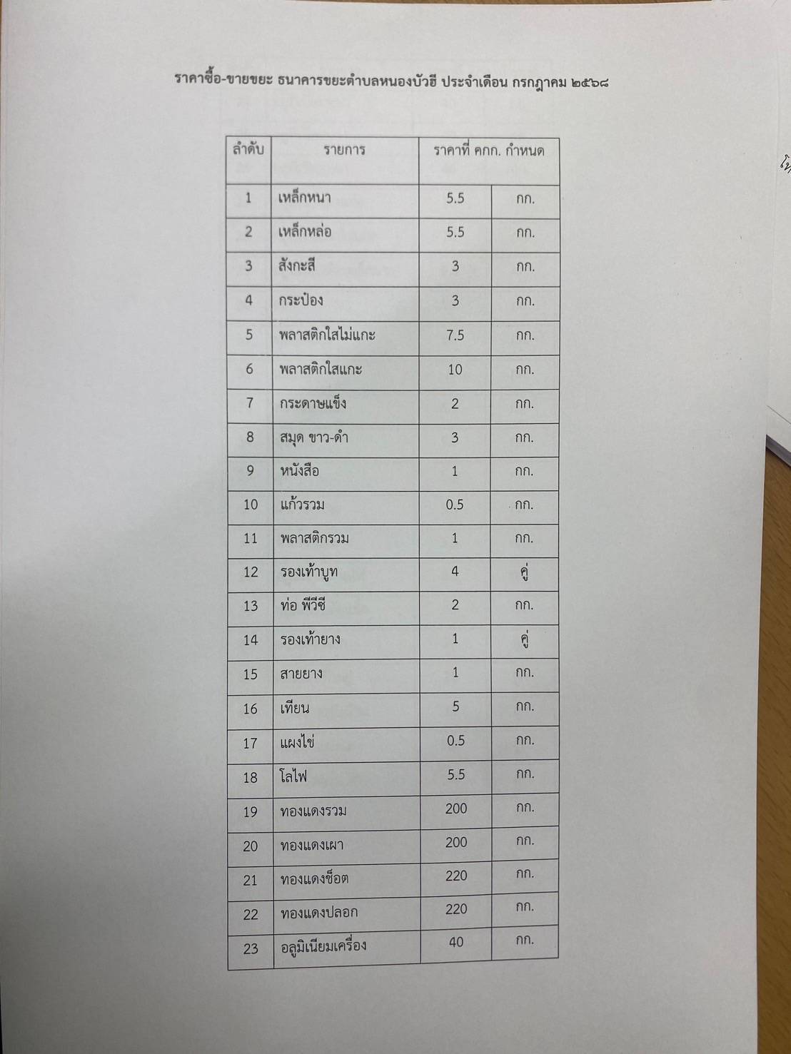 ประชาสัมพันธ์ราคากลางและกำหนดการรับซื้อขยะตามโครงการธนาคารขยะตำบลหนองบัวฮี ประจำเดือน กรกฎาคม พ.ศ. 2568